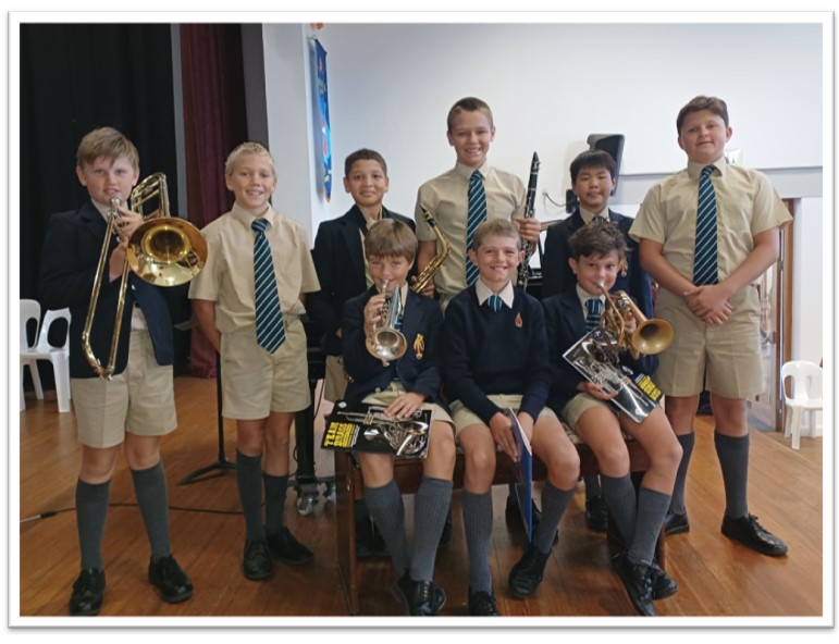 Back row: Rupert Anderson (trombone), Murray Prain (stage crew), Adam Shaik (saxophone), Daniel Twycross (clarinet), Mingjun Qiu (piano), Brodie Bassett (announcer)