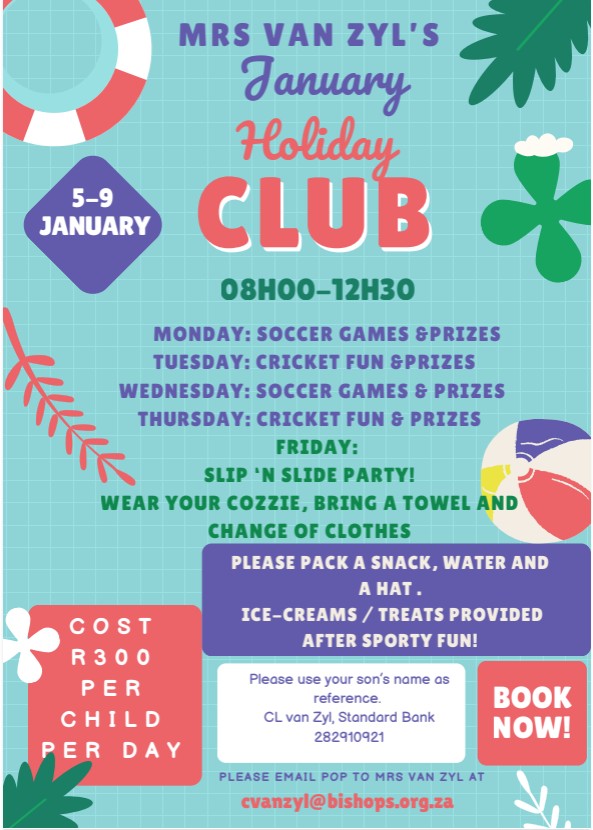 Please click HERE for further information on a Holiday Club offer from (04 and 05) and 15th to 19th December, hosted by Ms Rheeder.