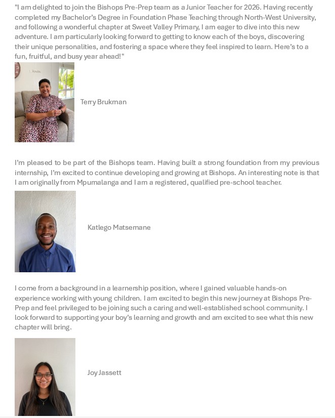 We welcomed staff new staff this year. Ms Terri Brukman has joined us from Sweet Valley Primary as our Junior Teacher and will be teaching all the boys over the course of the year. Ms Joy Jassett (Grade2) is joinig us from Bergvliet and Mr Katlego Matsemane (Grade 1) is joining us from Penryn Primary school are our new Foundation Phase Interns.